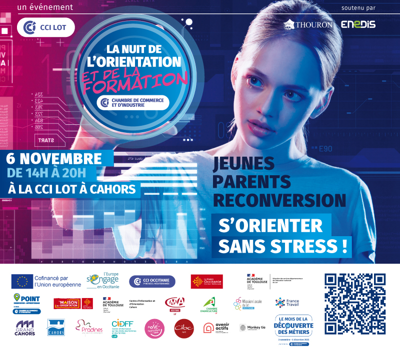 La nuit de l’orientation se déroulera le 6 novembre 2025 entre 14h et 20h sous chapiteau chauffé sur le parking de la CCI à Cahors.